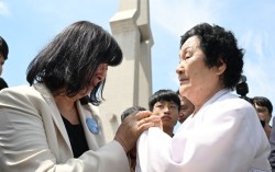 제45주년 5·18민주화운동 기념식이 열린 지난 18일 광주 북구 국립 5·18민주묘지에서 문재학 열사 어머니가 한국현대사연구회 소속 일본인 참배객과 슬픔을 나누고 있다. 뉴시스 “45년간 아픔만을 줬던 5·18이 올해는 슬픔과 기쁨을 동시에 주는 날이 …