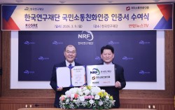 중소벤처기업인증원 엄진엽 원장(오른쪽)과 한국연구재단 홍원화 이사장이 국민소통친화 인증 수여식 후 함께 기념촬영을 하고 있다. 중소벤처기업인증원(원장 엄진엽, KOSRE)은 한국연구재단(이사장 홍원화)이 연구관리 전문기관 최초로 ‘국민소통친화’인증을 획득…