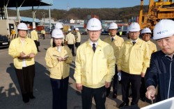 이재명 대통령이 8일 경기도 의왕 내륙컨테이너기지제2터미널 선·하적장 현장을 시찰하며 브리핑을 받고 있다. 청와대사진기자단 미국과 이란이 호르무즈 해협 개방을 조건으로 2주간 휴전에 합의한 8일 이재명 대통령은 경기 의왕 내륙컨테이너 기지를 찾아 화물운송·물류업계…