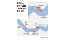 한강버스 항로 중 저수심 추정 15개 지점. 한강버스 측이 서울시에 저수심으로 추정된다고 보고한 지점. 1~15번은 보고 순서. 그래픽=차준홍 기자 한강버스는 도입 이후 현재까지 총 19번의 사고가 있었다. 시범운항 기간(3월 1일~9월 17일)에 10건…