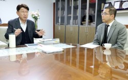 우범기 전주시장(왼쪽)과 피터 유 쿠뮤 필름 스튜디오 대표가 10일 전주시청에서 만나 전주에 2300억원 규모 아시아 제2 스튜디오를 짓겠다는 투자 제안서를 공유하며 후속 절차를 논의하고 있다. 사진 전주시 피터 유 쿠뮤 대표, 우범기 전주시장 만나 전주시…