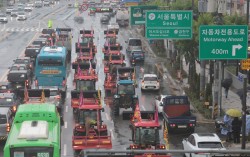 10일 전국농민회총연맹 전봉준투쟁단이 서울 금천구의 한 대로를 점거한 모습. 김성진 기자 전국농민회총연맹(전농) 전봉준투쟁단의 트랙터 상경 시위대가 10일 서울 진입을 시도했지만 금천구 시흥대로에서 경찰에 막혀 대치하고 있다. 이때문에 일대에선 극심한 교…