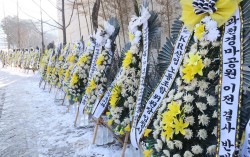 정부세종청사 국토교통부 앞에 정부의 1·29 부동산 대책 포함된 과천 경마공원 이전에 반대하는 근조화환이 줄지어 놓여 있다. 연합뉴스 정부가 1·29 부동산 대책을 발표한 가운데 한국마사회 노동조합이 이를 강력히 반대하고 나섰다. 경기 과천시 경마공원(렛츠런…