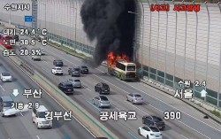 경부고속도로 버스 화재. 사진 한국도로공사 CCTV 화면 캡쳐 12일 오후 3시 58분쯤 경기 용인시 기흥구 경부고속도로 서울 방향 기흥휴게소 인근을 달리던 고속버스에서 불이 났다. 세종시에서 서울 강남구로 향하던 해당 버스에는 운전자와 승객 20여…