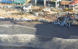2007년 12월 8일 유조선과 크레인선 충돌사고 이튿날 충남 만리포 해수욕장으로 밀려든 기름을 삼성자원봉사단원(파란 옷)들과 주민들이 퍼내고 있다. 중앙포토 2007년 태안 기름 유출 사고 이후 사고에 책임이 있는 삼성중공업이 피해 회복을 위해 내놓은 지역발전기…