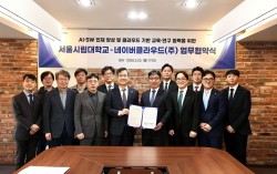 △왼쪽부터 서울시립대 도시과학빅데이터‧AI연구원장 유하진 교수, 통계학과 전종준 교수, 인공지능혁신융합대학 사업단장 이재호 교수, SW중심대학사업단장(겸 인공지능융합대학장) 김민호 교수, 연구처장(겸 산학협력단장) 이문규 교수, 이용희 교수, 원용걸 총장, 네이버클라우…