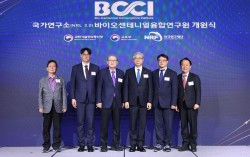 왼쪽부터 이혁모 한국연구재단 본부장, 송재환 연세대 생화학과 교수, 허동수 학교법인 연세대학교 이사장, 윤동섭 연세대 총장, 김성수 과기정통부 연구개발실장, 이성헌 서대문구청장. 연세대학교(총장 윤동섭)는 3월 10일 연세대 백양누리 그랜드볼룸에서 바이오…