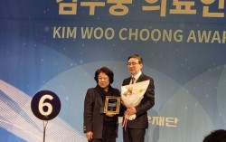 제5회 김우중 의료인상을 수상한 전진동 미즈메디병원 산부인과 의사(오른쪽)가 정희자 전 힐튼호텔 회장과 기념 촬영을 하고 있다. "산모들은 새로운 생명을 맞이하는 기대를 갖고 옵니다. 새 생명이 태어나는 순간의 기쁨을 같이 누릴 수 있다는 게 산부인과 …