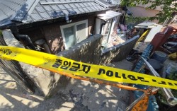 28일 오전 강원 강릉시 입암동 한 주택가에 폴리스라인이 설치돼 있다. 소방당국 등에 따르면 전날 오후 4시 32분쯤 이곳에서 포탄 폭발로 추정되는 사고가 발생했다. 연합뉴스 강원 강릉 주택가에서 군 포탄 폭발 사고가 발생했다. 28일 경찰과 소방 당국 …