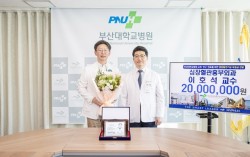 지난 23일 부산대병원에 기부금을 낸 이호석 교수(왼쪽)와 정성운 병원장. [사진 부산대병원] “혹시라도 정년이 늘어나면 매달 그만큼 더 기부하겠습니다.” 지난 23일 부산시 서구 부산대병원에서 열린 기부금 전달식에서 이 병원 심장혈관흉부외과 이호석(53…