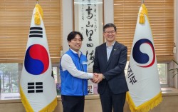 보건복지부 이기일 제1차관(오른쪽)과 보건복지부공무원노동조합 정승문 노조위원장이 간담회를 가진 후 함께 악수하며 기념촬영을 하고 있다. (사진=보건복지부공무원노동조합) 보건복지부공무원노동조합(위원장 정승문)과 이기일 보건복지부 제1차관은 직원 복지를 위해…