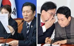 정청래 더불어민주당 대표(왼쪽 사진 오른쪽)가 19일 윤석열 전 대통령에게 무기징역이 선고된 것에 대해 유감을 표명하고 있다. 손에 든 자료는 사형 선고 때 발표하려던 것이다. 오른쪽 사진은 국민의힘 장동혁 대표(오른쪽)와 송언석 원내대표가 19일 귀엣말을 나누는 모습…