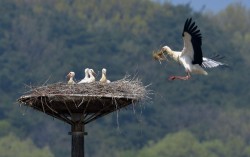 21일 충남 예산 황새공원 인근 둥지에서 천연기념물 제199호인 황새가 새끼가 있는 둥지 보수를 위해 나뭇가지를 옮기고 있다.