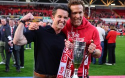 잉글랜드 프로축구 렉섬의 공동 구단주인 할리우드 배우 레이놀즈(오른쪽)와 매커해니가 26일 팀이 3연속 승격을 이뤄낸 뒤 트로피를 들고 기뻐하고 있다. [로이터=연합뉴스] 영화 ‘데드풀’ 주인공 라이언 레이놀즈(48·캐나다)가 공동 구단주인 잉글랜드 프로축구 리그…
