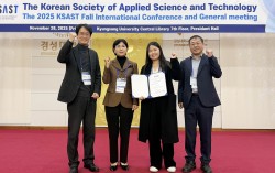 논문상 수상 후 기념촬영하는 이유림 학생(오른쪽 두 번째) 글로컬대학 대구한의대(총장 변창훈) 화장품학과 이유림 학생(석사2년, 지도교수 박찬익)이 지난 11월 28일(금) 부산 경성대학교에서 개최된 ‘2025 한국응용과학기술학회 국제 추계 학술대회’에서…
