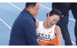 지난달 23일 인천국제마라톤에서 김완기 감독(왼쪽)이 1위로 골인하는 이수민 선수를 잡아주는 장면. 그러나 '부적절한 신체접촉' 논란이 일었다. 사진 유튜브 캡처 ‘부적절한 신체접촉’ 논란 후 자격정지 처분을 받은 김완기(58) 삼척시 육상팀 감독이 상급…
