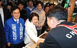 추미애 의원(가운데)이 6·3 지방선거 더불어민주당 경기도지사 후보로 7일 확정됐다. 지난 6일 수원 못골시장을 방문한 추 의원. [뉴스1] 추미애 의원이 7일 김동연 경기지사, 한준호 의원을 꺾고 6·3 지방선거 더불어민주당 경기지사 후보로 최종 선출됐…