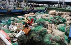 지난해 바다의 날을 앞두고 부산공동어시장에서 대형기선저인망수협이 제주 해역 인근에서 수거한 해양쓰레기 60t. 연합뉴스 불법·무허가 어구를 현장에서 즉시 철거하도록 하는 내용의 ‘수산업법 일부개정법률안’이 국무회의에서 의결됐다. 14일 해양수산부에 따르면 이…