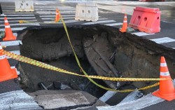 13일 오전 5시 40분쯤 부산 사상구 학장동에서 가로 3m, 세로 4.5m, 깊이 5m가량의 대형 싱크홀이 생겨났다. 사진 연합뉴스 부산 도시철도 사상~하단선 인근 도심 차로에서 또다시 싱크홀(땅 꺼짐ㆍsinkhole) 사고가 일어났다. 잇따른 땅 …