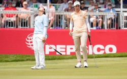 대회 최종라운드 18번 홀에서 아쉬워하는 최혜진(왼쪽)과 우승자 시간다. [AFP=연합뉴스] 최혜진(26)이 또 한 번 우승 문턱에서 아쉬움을 삼켰다. 최혜진은 16일(한국시간) 미국 미시간주 벨몬트 블라이더필즈 골프장에서 열린 미국여자프로골프(LP…
