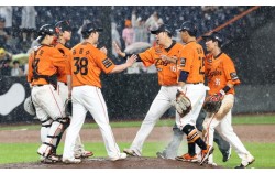 한화 이글스 선수들이 지난 15일 LG 트윈스에 10-5 승리를 거두며 33일 만에 정규 시즌 선두를 탈환한 직후 기쁨을 나누고 있다. [뉴스1] 침묵하던 4번타자 노시환(25)이 살아났다. 잡힐 듯 잡히지 않던 단독 선두도 되찾았다. 프로야구 한화 이글…