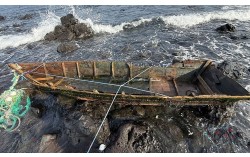 지난 1월 제주 애월읍에서 발견된 목선. 사진 제주해양경찰청, 제주 우도 해안가에서 발견된 정체불명의 목선에서 북한 노동신문이 있다는 신고가 접수돼 수사당국이 조사에 나섰다. 4일 서귀포해양경찰서와 제주경찰청 등에 따르면 이날 오전 9시 40분쯤 제주시 우도…