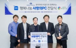 지난 9일 원익머트리얼즈 본사 회의실에서 열린 ‘행복나눔 사랑의PC전달식’에서 (왼쪽부터) 송태호 그룹장, 도현수 전무, 한정욱 대표이사, 한국벧엘복지재단 전병민 팀장, 클린업시스템즈 김수영 대표가 기념촬영을 하고 있다. (사진 제공=원익머트리얼즈) 반도…