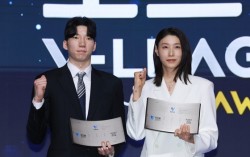 영광의 MVP 수상 허수봉-김연경 (서울=연합뉴스) 신현우 기자 = 14일 서울 서대문구 스위스그랜드호텔에서 열린 프로배구 도드람 2024-2025 V리그 시상식에서 여자부 정규리그 MVP를 수상한 김연경(오른쪽)과 남자부 정규리그 MVP를 수상한 현대캐피탈 허수봉…