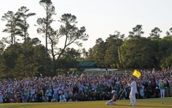 14일(한국시간) 마스터스 우승을 확정한 로리 매킬로이가 무릎을 꿇으며 감격하자 수많은 갤러리가 환호와 박수로 축하하고 있다. 매킬로이는 드라마 같은 승부 끝에 연장 우승을 차지해 역대 6번째 커리어 그랜드슬램을 달성했다. [EPA=연합뉴스] 로리 매킬로…
