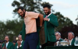 마스터스 토너먼트의 올해 총상금 규모가 300억원, 우승 상금은 60억원으로 정해졌다. 사진은 지난해 마스터스에서 우승한 뒤 챔피언에게 주어지는 그린 재킷을 착용하는 욘 람(왼쪽). 로이터=연합뉴스 남자 골프 첫 메이저 대회 …
