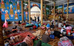 9일(현지시간) 캄보디아-태국 국경 충돌로 주민들이 대피해 캄보디아 시엠레아프의 한 사원에서 쉬고 있다. 이날 국경 지역에서 재차 충돌이 발생해 태국군 2명이 추가로 사망하면서 태국군 사망자는 3명으로 늘었다. AFP=연합뉴스 태국과 캄보디아가 국경지대에…