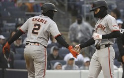 6회 뉴욕 양키스를 상대로 득점을 올린 직후 팀 동료 윌리 아다메스(왼쪽)와 하이파이브를 나누는 이정후. AP=연합뉴스 메이저리그(MLB)에서 활약 중인 ‘바람의 손자’ 이정후(27·샌프란시스코 자이언츠)가 뉴욕 양키스를 상대…
