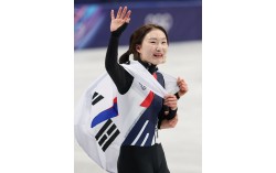 쇼트트랙 최민정이 18일(현지시간) 이탈리아 밀라노 아이스스케이팅 아레나에서 열린 2026 밀라노 코르티나담페초 동계올림픽 쇼트트랙 여자 3000m 계주에서 금메달을 확정한 뒤 태극기를 두르고 기뻐하고 있다. 김종호 기자 20260218 대한민국 쇼트트랙…