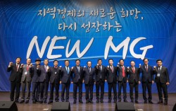 김인 새마을금고중앙회장(오른쪽에서 7번째)과 윤호중 행정안전부장관(오른쪽에서 8번째) 및 관계자들이 26일 충남 천안 MG인재개발원에서 새마을금고비전2030 선포식 '다시 성장하는 New MG'를 열고 이사장 300여 명과 함께 "지역경제의 새로운 희망이 되겠다"라며 …