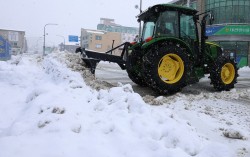 2일 강원 평창군 대관령에서 한 주민이 제설 장비를 동원해 폭설 속에 눈을 치우고 있다. 연합뉴스〉 강원 산지에 최대 40㎝에 달하는 폭설이 예보되면서 대설특보가 확대됐다. 기상청은 2일 오후 2시를 기해 강원 남부산지에 내려진 대설주의보를 대설경보…
