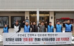 국가공무원노동조합과 국가공무원노조 국가유산청지부원들이 4일 오후 서울 종로구 종로경찰서 앞에서 윤석열 전 대통령 부인 김건희 여사의 ‘국가유산 사유화’ 논란 관련 핵심 당사자인 최응천 전 국가유산청장을 직권남용 및 직무유기 등의 혐의로 경찰에 고발하기 앞서 기자회견을 …