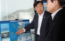 이재명 대통령(오른쪽)이 지난 4월 24일 새만금을 찾아 김관영 지사의 설명을 듣고 있다. [뉴스1] 이재명 대통령이 최근 새만금 개발의 더딘 속도와 사업의 모호성을 지적하며 한 ‘희망 고문’ 발언을 두고 전북특별자치도와 지역 정치권이 ‘제 논에 물 대기…
