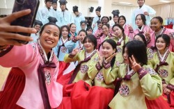 동서대 외국어교육원 소속 외국 유학생들이 15일 전통 한복을 입고 기념사진을 찍고 있다. 이 대학 한국어 연수과정에 참가한 32개국의 학생 530여 명은 내달 30일까지 총 12차례에 걸쳐 안락서원에서 전통예절 등을 체험한다.