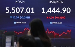 지난 13일 오후 서울 중구 우리은행 본점 딜링룸 전광판에 코스피와 코스닥, 원·달러 환율 등 종가가 표시되고 있다. 이날 코스피 지수는 전 거래일 대비 15.26포인트(0.28%) 내린 5,507.01로 장을 마쳤다. 장중 5583.74를 기록하면서 전날 기록한 …