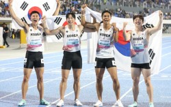 아시아 정상에 선 육상 남자 400m 계주팀. 왼쪽부터 나마디 조엘진, 서민준, 이준혁, 이재성. 연합뉴스 한국 남자 육상이 400m 계주에서 ‘세 마리 토끼’를 잡았다. 지난달 31일 경북 구미에서 열린 2025 아시아육상선수권 결선에서 38초49로 우…