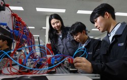 지난달 17일 경기 수원 수원하이텍고에서 3학년 전은지(자동화시스템과, 가장 왼쪽), 이호왕(정밀기계과), 강희준(전기전자제어과) 학생이 자동제어시스템(PLC) 설비를 이용해 반도체 생산 분야에서 활용되는 자동화 설비 공정이 작동되는 원리를 배우고 있다. 김종호 기자 …