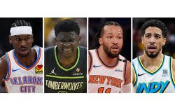 NBA 4강 주역들. 왼쪽부터 샤이 길저스-알렉산더(오클라호마시티 선더스), 앤서니 에드워즈(미네소타 팀버울브스), 제일런 브런슨(뉴욕 닉스), 타이리스 할리버튼(인디애나 페이서스). 오클라호마시티와 미네소타의 1차전은 21일, 뉴욕과 인디애나는 22일 붙는다. [AP…