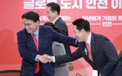 장동혁 국민의힘 대표(오른쪽)가 6일 인천시당에서 열린 현장최고위원회의에 참석하며 윤상현(인천 동구미추홀구을) 의원과 인사하고 있다. [연합뉴스] 6·3 지방선거를 58일 앞둔 6일, 장동혁 국민의힘 대표가 올해 처음으로 주재한 현장 최고위원회에서 지도부…