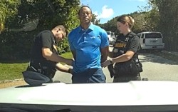 '골프 황제' 타이거 우즈(가운데)가 지난달 말 약물 운전 혐의로 체포됐을 당시 경찰관 보디캠 영상. AP=연합뉴스 '골프 황제' 타이거 우즈(51·미국)가 약물 운전 혐의로 체포될 당시 경찰관에게 "방금 대통령과 통화했다"고 말하는 영상이 공개됐다. AP …