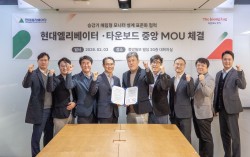 중앙그룹 디지털 사이니지 전문 기업 타운보드중앙은 3일 현대엘리베이터와 승강기 내부 매립형 모니터 설계 표준 마련을 위한 업무협약(MOU)을 체결했다고 밝혔다. 이날 서울 상암동 중앙일보 빌딩에서 열린 협약식에서 참석자들이 화이팅을 외치고 있다. 중앙포토 …