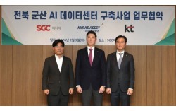 SGC에너지가 3일 서울 서초구 SGC에너지 본사에서 KT·미래에셋증권과 인공지능(AI) 데이터센터 구축 사업을 위한 업무협약을 맺었다. 왼쪽부터 조양호 KT 상무, 이우성 SGC에너지 대표이사, 김정수 미래에셋증권 IB 2부문 대표. 사진 SGC 에너지 …