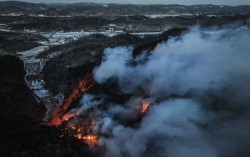 11일 오전 경북 의성군 의성읍 일대에 눈이 쌓인 가운데 인근 야산에서 전날 발생한 산불의 잔불이 남아 타오르고 있다. 연합뉴스 경북 의성군의 야산에서 지난 10일 발생한 산불이 18시간 만에 모두 꺼졌다. 산림청은 11일 오전 9시 의성 산불의 잔…