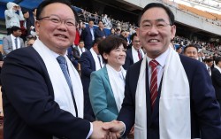 김부겸 전 국무총리(왼쪽)와 주호영 국회부의장이 5일 오후 대구스타디움에서 열린 ‘2026 대구 기독교 부활절 연합예배’에서 만나 인사하고 있다. 김 전 총리는 대구시장 출마를 선언했다. [뉴시스] 대구시장 선거가 ‘4파전’으로 치러질 가능성이 거론되고 …