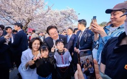 이재명 대통령과 김혜경 여사가 5일 오후 서울 여의도 윤중로를 찾아 시민들과 기념사진을 찍고 있다. 사진 청와대 이재명 대통령이 식목일을 맞아 청와대와 관저에 나무를 심고, 여의도 윤중로를 찾아 시민들과 소통하는 시간을 가졌다. 이 대통령은 5일 페…