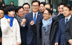 송영길(앞줄 왼쪽 세 번째) 소나무당 대표가 13일 서울 서초구 서울고등법원에서 열린 '더불어민주당 전당대회 돈봉투' 의혹 관련 2심에서 무죄를 선고 받은 뒤 기념촬영하고 있다. 뉴시스 송영길 소나무당 대표가 13일 ‘전당대회 돈 봉투 살포’ 2심 재판에…